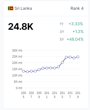 تعتبر سريلانكا مصدرًا لأفضل جودة من القرفة في العالم. وقد ساهمت البلاد بنسبة 10.23% من إجمالي إنتاج العالم من القرفة في عام 2020، والتي بلغت 24,800 طن، مما يجعلها واحدة من أكبر منتجي القرفة على مستوى العالم. تتمركز زراعة القرفة بشكل رئيسي على طول الحزام الساحلي من كالوتارا إلى ماتارا، ويمكن العثور على بعض المزارع في مناطق مثل راتنابورا وأمبالانغودا. وتبلغ مساحة مزارع القرفة في سريلانكا حوالي 25,000 هكتار. ومع ذلك، فإن حجم المزارع قد انخفض عبر السنوات.